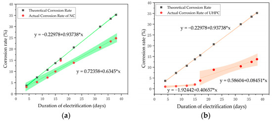The fitted linear corrosion rate curves for the concrete and UHPC short columns: (a) the fitted corrosion rate curve for the NC specimens and (b) the fitted corrosion rate curve for the UHPC specimens.