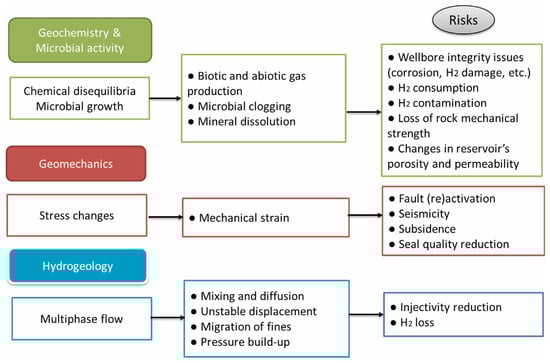 Depleted hydrocarbon resources are the most appropriate because hydrogen can be produced and delivered similarly to natural gas, and existing gas infrastructure can be converted to hydrogen use. Hydrogen storage in abandoned oil and gas reservoirs is an affordable solution. However, it is important to note that this approach also has certain disadvantages, including the possibility that residual gas or oil would lower the purity of the hydrogen, and the hydrogen may harm the reservoir’s top seal []. The different challenges associated with underground hydrogen storage in depleted hydrocarbon reservoirs are presented in Figure 1. However, difficulties with wellbore integrity could be the leading cause of problems during the injection and withdrawal of hydrogen [].