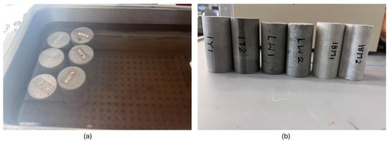 LW1 and LW2 are field blends applied at a total vertical depth (TVD) of 2286 m for the intermediate casing with a density of 1.6 g/cc. LW1 and LW2 contain additives such as silica flour, extenders, fluid loss agents, and defoaming agents. The slurries were blended following the API-RP-10B-2 regulations. The cement was then poured into cylindrical molds of a 3.81 cm diameter and 7.62 cm length and cured for 12 and 18 months in an isothermal water bath at 50 °C (Figure 2a,b). All the cement batches were cured with four samples in a batch. Hydrogen with a purity of 99.99% from Airgas was used.