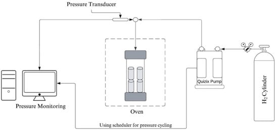 The experimental setup used in this study is shown below (Figure 3). The experimental conditions in this study simulated the reservoir conditions for UHS with a hydrogen storage pressure of 10.34 MPa at a temperature of 50 °C. The pressure and temperature conditions were estimated by referring to studies in hydrogen storage that mention the optimum operating conditions [,]. The cement specimens underwent exposure to hydrogen gas within a core holder apparatus utilizing an Ametek Chandler Engineering 2-cylinder Quizix pump (Chandler Engineering, Broken Arrow, OK, USA), with constant pressure maintained via pressure ramp cycling scheduler software. Pressure ramping occurred for 5 h at a rate of 2.06 MPa/hr, followed by a 28-day constant pressure set at 10.34 MPa. Subsequently, pressure reduction was executed over 5 h using the scheduler. The pressure of the system was monitored using a data acquisition system consisting of the Omega Digital Transducer Application software (version 2.3.1.306) and pressure transducers. This pressure cycling protocol was repeated for three cycles spanning 28 days each. Before each exposure cycle, a vacuum pump was employed to remove the air in the core holder. After the exposure cycles, the samples were placed inside air-tight containers to eliminate the possibility of reacting with the moisture in the air.