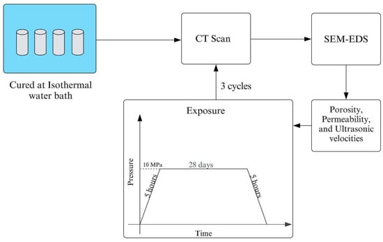 Computed tomography was employed to identify any pre-existing cracks or deformations within the specimens. The Ceretom® NL3000 transportable small-bore CT scanner (Neurologica, Danvers, MA, USA), which has a maximum slice thickness resolution of 1.25 mm, is used to acquire the images. Because the CT scanner has eight detector rows, it may acquire eight picture slices simultaneously during a complete rotation. The scanner runs on tube voltages between 100 and 140 kV and currents between 1 and 7 mA. The scanner has a maximum scanning range of 64 cm and a rotation time range of 2 to 6 s. The thickness of each acquired picture slice is 1.25 mm. The image acquisition was performed before and after each pressure cycle, and the images were analyzed using ImageJ software to detect any cracks in the cement. Following each exposure cycle, a comprehensive analysis was conducted, encompassing computed tomography, scanning electron microscopy coupled with energy dispersive spectroscopy (SEM-EDS), evaluation of porosity and permeability, and measurement of ultrasonic velocities in the samples to calculate the dynamic elastic properties.