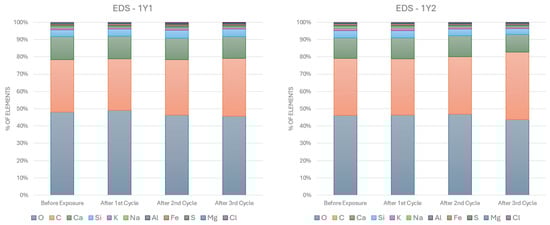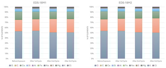The SEM images of the cement samples are presented in Table 2. The spots were marked to obtain an SEM image of the exact location and ensure accuracy. The cement samples’ SEM images were captured at 40, 100, 300, and 500 magnifications. The images presented are of 300 magnifications. The analyses of the samples highlighted no significant differences in microstructure before and after the exposure cycles.