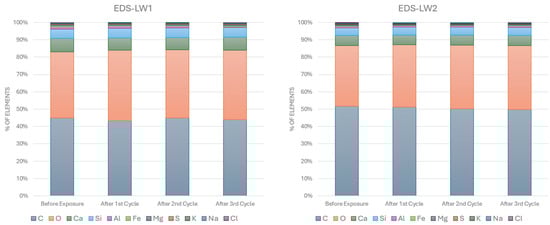The porosity of the samples before and after exposure cycles is presented in Figure 8. There was an overall increase in the porosity of the samples after the cyclic exposures, with the most notable increment observed in samples after the first cycle for 1Y2, 18M1, and 18M2 samples. An overall increase in the porosity of LW2 is observed, and there is an overall reduction in LW1 porosity values. However, the changes in the LW1 and LW2 samples are not significant. After the first exposure cycle, approximately 29% and 21% change is observed in the porosity values of sample 18M1 and 1Y2, respectively. In contrast, sample 18M2 exhibits a porosity increase of 18% after the first cycle. Through micro-CT imaging, Al Yaseri et al. [] evaluated the changes in porosity and concluded that there was a minimal decrease in porosity that can be attributed to the precipitation of the calcite and other high-density minerals in the cement. The observations were made through a spot analysis calculating the total porosity of Class G cement, whereas, in this study, effective porosity was measured for Class H cement.