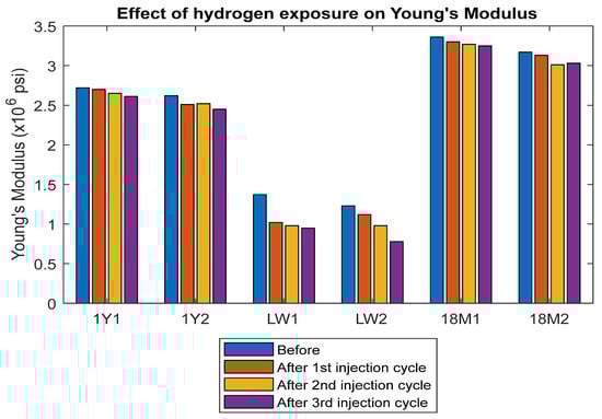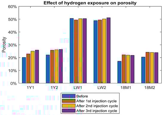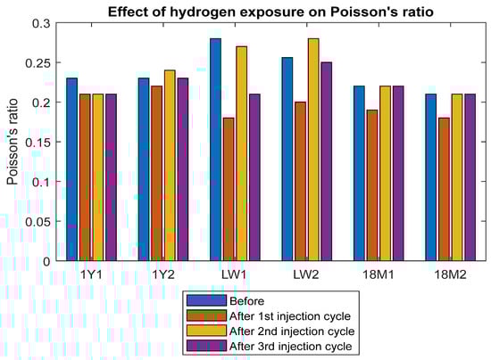 However, the Poisson’s ratio changes observed in the samples were insignificant. The Poisson’s ratio values before and after hydrogen exposure were in the range of 0.2–0.24, which is similar to the values reported in the literature, confirming cement as a low-brittle material [].