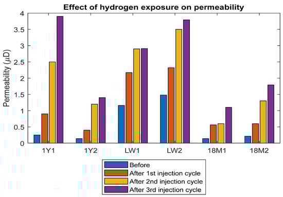 The permeability of the samples before and after treatment is presented in Figure 9. Permeability is a more sensitive indicator of changes in the properties of the sample attributes than porosity. The permeability of the samples increased after the cyclic hydrogen exposure, indicating changes in the pore network. Unlike the porosity results, the permeability of the samples showed a significant increase after each exposure cycle on all the samples. Sample 1Y1 exhibited the most increase in permeability values, while 18M1 demonstrated the least increase in permeability. After three cycles, the permeability of 18M1 increased from 0.14 μD to 1.1 μD. For 18M2, the permeability increased from 0.21 μD to 1.79 μD. Samples 1Y2, LW1, and LW2 have a minimal increase in permeability after the second exposure cycle. The dissolution of pore throats can lead to significant changes in permeability, whereas the corresponding modifications in porosity may be minimal. Nasiri et al. [] evaluated field samples’ permeability before and after hydrogen injection, where they concluded an increase in permeability of 0.0442 mD when Class G cement was exposed to pure H2 gas. However, considering this change in permeability in our results, the resulting values are considered appropriate for tight cement being able to make a good seal. Teodoriu et al. [] mentioned in their study that cement is considered to make a good seal if its permeability is less than 0.01 mD. Further long-term hydrogen exposure of cement samples is required to evaluate the effect of hydrogen in permeability altercations.