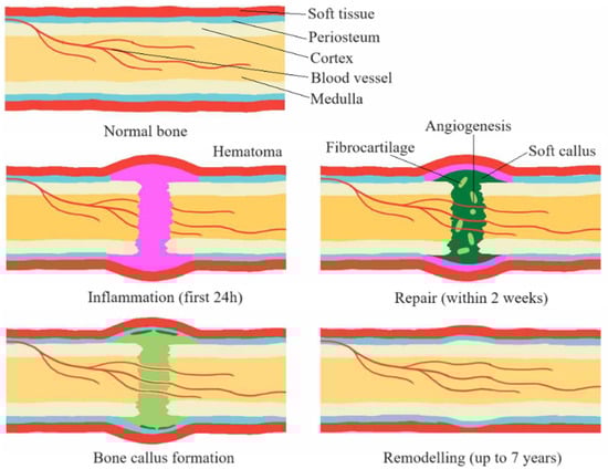 A bone fracture initiates not only the process of repairing the bone tissue itself, but also damages the periosteum and endosteum, which is a stimulus for repair. This process involves a number of complex biochemical and biomechanical interactions in which cytokines, mesenchymal stem cells, and the regulation of angiogenic processes play a key role. This results in the activation of repair processes, including the process of creating inflammation, which is crucial for the initiation of healing [19,20].