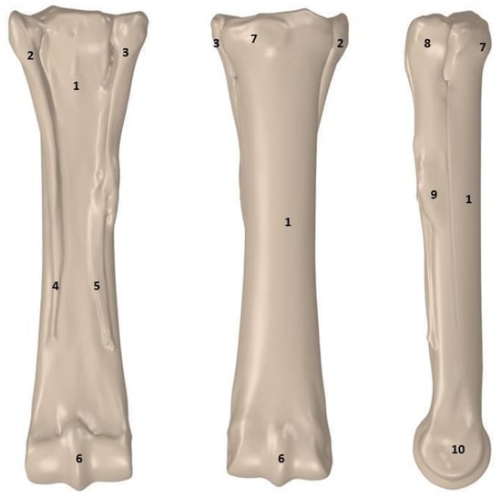 Metacarpal bones of the thoracic limb in three views: 1—body of the 3rd metacarpal bone; 2—lateral splint head; 3—medial splint head; 4—distal end of the 4th metacarpal bone; 5—distal end of the 2nd metacarpal bone; 6—sagittal ridge; 7—metacarpal tuberosity; 8—head of the 2nd metacarpal bone; 9—body of the 2nd metacarpal bone; 10—medial collateral fossa [26].