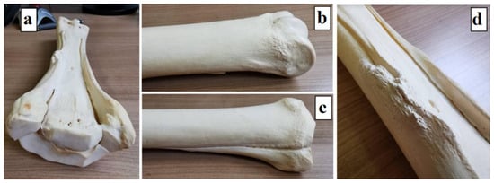 The bone model came from an adult horse from the Wrocław University of Environmental and Life Sciences teaching materials; therefore, no animals were harmed for the purposes of creating this article (Figure 6); the bone length was 280 mm while the pony’s third metacarpal is proportionately smaller due to its size. The length of the modelled bone was 148 mm, so the model was scaled.