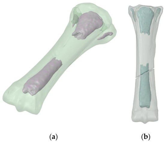 The next step was to perform a 3D scan of the supplied material and scale it to the dimensions described earlier. This allowed us to obtain two models in .stl format, trabecular bone and cortical bone. The basis for the creation of the model is composite X-ray images of the specimen taken from different directions; .stl format saves three-dimensional objects in the form of a mesh. As a result of this, a computer model was obtained with dimensions corresponding to the actual dimensions of the pony (Figure 7a). The model was cleaned of artifacts, so it consisted of the main part of cortical bone and 4 trabecular bone elements. Then, a crack was created throughout the entire volume of the bone (Figure 7b).