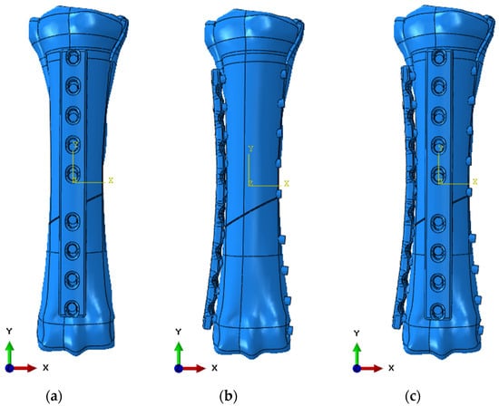 Numerical model in ABAQUS 6.13 software: (a) anterior stabilization; (b) lateral stabilization; and (c) anterolateral stabilization.