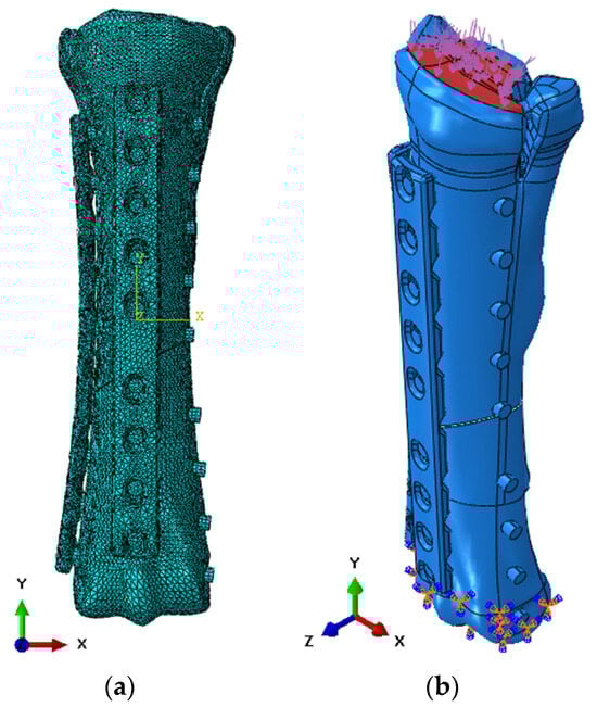 After determining the initial loads during static analyses, a simulation was performed in the ABAQUS/Explicit solver to observe the propagation of damage during movement at a speed of 5.0 km/h. The model was discretized using 10-node tetrahedral elements from the Explicit library. General contact was used as the contact between the elements, with a friction coefficient of 0.38 based on literature data [29]. Basic finite elements with dimensions of 2.0 mm were used, but compaction was also used at the edges of the holes and to discretize bone screws (Figure 9a). The value of pressure distributed on the upper surface of the bone was taken as the load (Figure 9b).