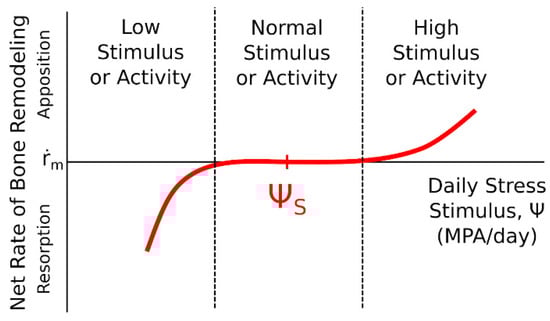 The influence of a mechanical stimulus on adaptive changes in bone tissue—Carter’s model [49,50].
