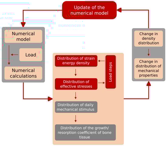 The only frequently used mechanobiological model is the Carter model developed in 1984 based on Frost’s theory. In this mathematical model, mechanical stimuli, such as uniaxial compression and tension, play a key role, causing deformations and determining the adaptation and remodelling of bone tissue [48].