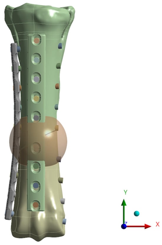 The geometric model used in static calculations in the Ansys Workbench 2024 R1 environment was divided using 10-node elements of a higher order. Static tests were carried out in the Ansys program in order to initially determine the stresses and displacements of the structure. The load values were 353 N for a horse standing still, 483 N for a horse moving at a speed of 2.5 km/h, and 2400 N for a horse moving at a speed of 5.0 km/h. The adopted values come from studies included in sources [27,28], in which the authors calculated the N/kg value depending on the animal’s movement speed. The model mesh has been refined in the areas of implant–bone contact, bone–screw contact, and implant–screw contact areas. The model assumed that the contact connections between bone screws and bone and between screws and bone plates are of the bonded type. Contacts between the bone plate and the bone surface were defined as frictional with a friction coefficient of 0.38 [29]. The model also generated the volume of bone scar in the form of a solid sphere, which was placed symmetrically between the bone fragments. The contact connection between the scar and the fragments was modelled as a bonded type contact. The connection between the bone scar and the implant was omitted. Fixing the implant was achieved by removing all degrees of freedom on the articular surface belonging to the distal end of the bone (Figure 9). The load in the form of nodal forces with specific values and directions of action was applied to the articular surfaces of the proximal end. As a result of the calculations, the distributions of reduced stresses and main stresses 1 and 3 in the volume of the bone and implant were obtained. Nodal displacements on the surfaces in contact with bone fragments were recorded in the volume of the bone scar. These displacements were then mapped onto an isolated bone scar model, in which changes in the density distribution depending on the type of stabilization were predicted using a program based on Carter’s algorithm [30].