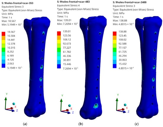 Examples of obtained H–M–H stress distributions for anterior stabilization: (a) 353 N; (b) 483 N; and (c) 2400 N.
