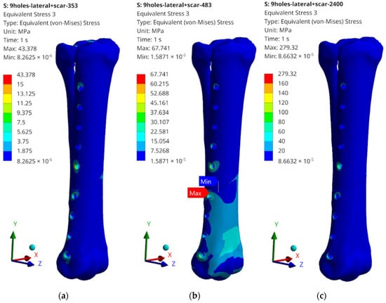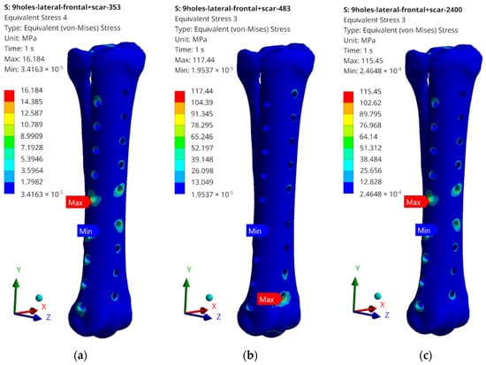 Examples of obtained H–M–H stress distributions for lateral stabilization: (a) 353 N; (b) 483 N; and (c) 2400 N.