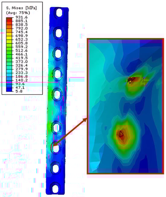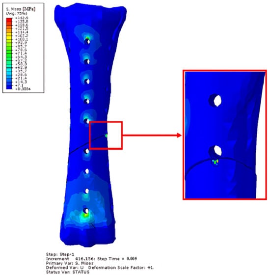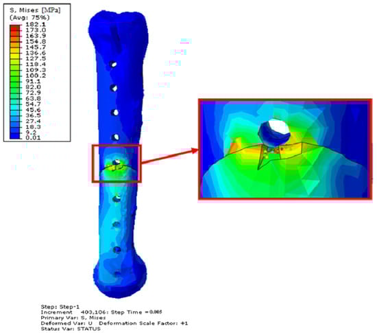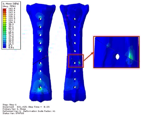 The places where the material’s yield strength was significantly exceeded were the places where the screws contacted the implant, and these places may also be potential places of loss of stability between the implant–bone system.