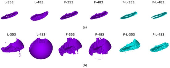 The bone remodelling process is shown below (Figure 21). Each figure shows subsequent stages of the process of reconstruction (remodelling) of bone tissue. In addition, there are also markings for individual types of stabilization and load. F—frontal, L—lateral, F-L—anterolateral, 353–353 N and 483–483 N.