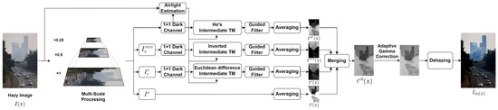 | Algorithm 1 Enhanced Transmission Map with Multiscale Multiple Features DCP and Adaptive Gamma Correction |