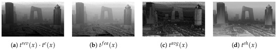 Nonetheless, such contrast adjustment could potentially obscure or eliminate specific image details. Therefore, we take an average of and , yielding , which results in darker structural elements and brighter hazy regions, as illustrated in Figure 2c.