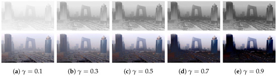 Gamma correction is a remedy that involves adjusting pixel values in an image to compensate for the non-linear way human eyes perceive light through a parameter [19]. As shown in Figure 3 and Figure 4, when is increased, images become darker, gradually reducing fog, whereas decreasing retains more fog. An improper selection of may result in insufficient darkening or ineffective fog removal. Therefore, choosing an appropriate should consider the characteristics of the fog image. Instead of manual adjustment, we propose an adaptive approach to determine the value based on the maximum and minimum values of the enhanced transmission map :