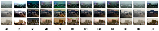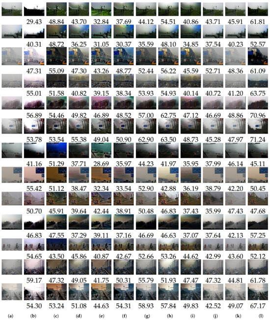 Our approach excels in images with light-to-moderate haze, ensuring that object features remain clearly visible. However, as demonstrated in row #4 of Figure 9l, when haze becomes too dense, there is a heightened risk of losing structural details, leading to incomplete haze removal. This limitation is particularly noticeable with distant structures heavily obscured by thick haze, where the fine details become challenging to recover, making it difficult to remove the haze effectively while preserving the clarity of objects. Furthermore, as shown in row #7 of Figure 9l, using a guided filter can occasionally result in a stair-step effect in sky regions with sharp color transitions.