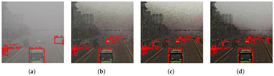 Figure 8 visually demonstrates the efficacy of employing a DCP and guided filter combination for more precise and detailed dehazing, consequently improving object detection performance. The contrast between using He et al. [4] and our DCP and guided filter is highlighted in Figure 8b and Figure 8c, respectively. Additionally, as depicted in Figure 8d, a multiscale approach boosts object detection confidence.