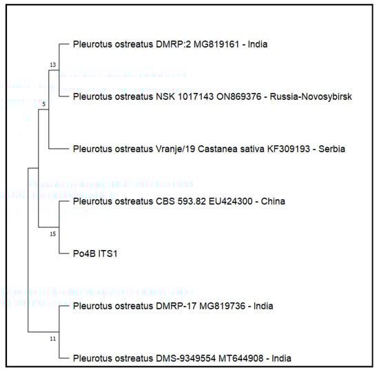 The Po4 strain was identified according to the morphological features and by sequencing the ITS1-ITS region and comparing the sequence to the GenBank database []. For this purpose, the mycelium was cultured in a liquid peptone medium (10 g peptone dissolved in 1 dm3), and the DNA was isolated from it using an isolation kit (Bead-Beat Micro AX Gravity, A&A Biotechnology, Gdynia, Poland). The genomic DNA was used for amplifying the ITS1-ITS2 region in a PCR reaction using primers ITS1 and ITS4. The reaction conditions were as follows: initial denaturation at 94 °C for 2 min; 30 cycles of denaturation at 94 °C for 60 s, annealing at 50 °C for 60 s, and extension at 72 °C for 3 min; followed by a final extension for 10 min of 72 °C. Amplification of the DNA fragments was performed in a Bio-RadT100™ Thermal Cycler (Tokyo, Japan). Sequencing of obtained DNA fragments was performed in Genomed (Gdańsk, Poland), and in the next step, sequences were compared to the NCBI database. Six sequences were used in the analysis: EU424300.2, MG819161.1, MG819736.1, MT644908.1, ON869376.1, and KF309193.1 and they were applied to build a phylogenetic tree. Phylogenetic analysis was realized in MEGA X software using the Likelihood method and the Tamura–Nei model with 1000 bootstrap repetitions [].