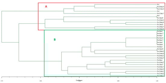 Dendrogram showing the similarity within the analyzed mycelia; dendrogram made using the UPMGA method (NTSYS software, No. NTSYSpc 2.21w); explanations of abbreviations: Po4-20dix17—crossing according to the Buller phenomenon, where the digit on the left, e.g., 20di—is a dikaryon, and the digit on the right is a monokaryon, x—sign of crossing, A—cluster A, B—cluster B.
