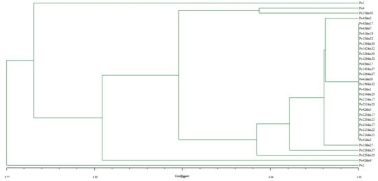Dendrogram illustrating the molecular similarity of the tested mycelia; dendrogram made using the UPMGA method (NTSYS software, No. NTSYSpc 2.21w); explanations of abbreviations like in Figure 3.