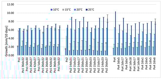 Differences in growth at individual temperatures for individual mycelia allow the identification of those mycelia characterized by an individual faster growth rate, such as Po4 3dix7 and Po4 2dix5, which are characterized by good growth at temperatures of 15, 20, and 25 °C, better than the other tested mycelia (Figure 5 and Figure 6).