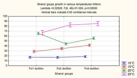 Temperatures significantly affected the growth of the tested mycelia, and although different types of mycelia responded differently to different temperatures, this was not true for growth at 10 °C (Figure 5 and Figure 6, Table 1). Increasing the temperature accelerated the growth of the mycelia, and although, in the case of the Po1 progenies group, the difference between the growth rate at 20 and 25 °C was small, these mycelia reached high growth values at higher temperatures (Figure 5, Table 1).