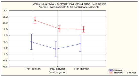 The average growth of mycelia in groups of Buller progenies (signed as dixMon) of Po1, Po2, and Po4 (p = 0.05).