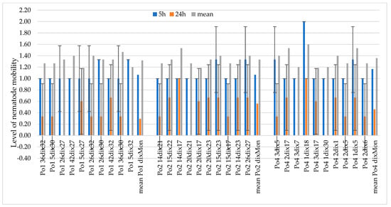For the collected mycelia the nematocidal properties were checked against the model nematode C. elegans N2 strain and beet pathogen—H. schachtii. Tests against C. elegans were prepared on water agar. When mycelia were sufficiently developed, usually after two weeks, they were treated with drops of a suspension containing C. elegans nematodes. After periods of 1, 3, 5, 24, and 48 h, the viability of the nematodes was determined, taking into account their mobility. The mycelium reaction was assessed by checking the toxin-producing processes. Both studies were assessed using two scales (0–3) developed in the previous study []. The experiment was carried out in three replications. Data of toxin production were presented as means in the whole experiment vs. controls, and the mobility results for the 5th and 24th hours of the test were shown on the graphs together with means of the mobility assessments in the whole experiment (1–48 h).