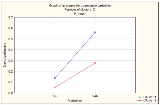 Analysis of cluster averages by K-means, considering nematode C. elegans mobility as a result of toxic properties of tested mycelia developed in 5 h and 24 h.