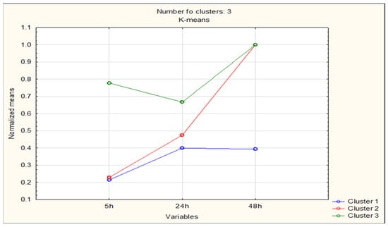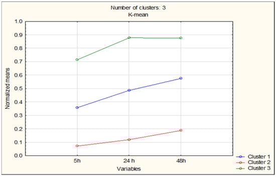 Analysis of cluster averages by K-means, considering entwinement of cysts by tested mycelia developed in 5 h, 24 h, and 48 h.