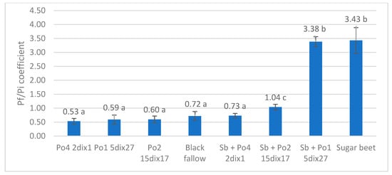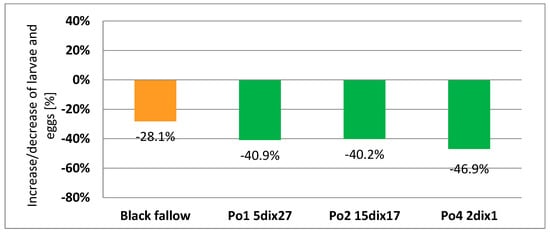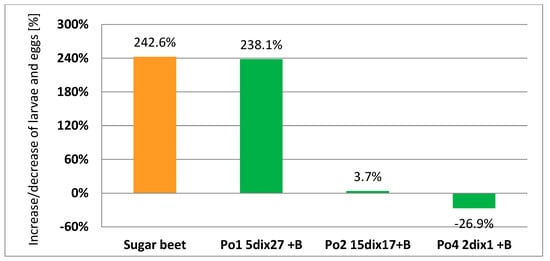 In the pot experiment, all tested oyster mushroom strains inoculated to the soil without plant cultivation contributed to a significant reduction in the population of the beet cyst nematode H. shachtii. In the soil without mycelium (black fallow), a 28.1% reduction in the number of nematodes was observed. The mycelia (Po1 5dix27, Po2 15dix17, and Po4 2dix1) introduced into the pots caused a reduction in the population of the beet cyst nematode by 40.9%, 40.2% and 46.9%, respectively (Figure 18). The joint effect of sugar beet plants and Po2 15dix17 mycelium resulted in a slight increase in the number of H. schachtii eggs and larvae (3.7%). However, significantly, the highest increase in the number of nematodes was observed in the control pots (sugar beet plants without any mycelium), which demonstrated 242.6% of the initial infestation; whereas the soil inoculated with Po1 5dix27 mycelium and sown with sugar beets demonstrated 238.1% (Figure 19). The Pf/Pi coefficients confirmed the protective role of the mycelia introduced into the soil, showing the best result for the Po4 Buller progeny (Po4 2dix1), which, even with the combined growth with sugar beet, could decrease the H. schachtii population in the soil (Figure 20).