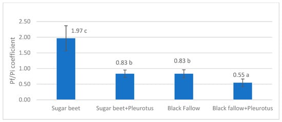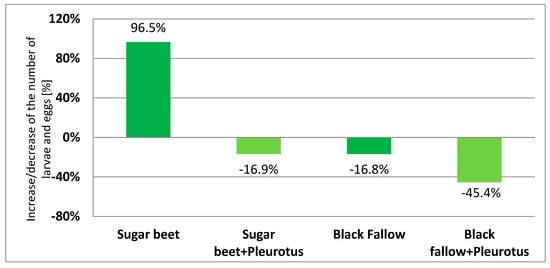 The microplot experiment realized in the field, in breeding tents, resulted in a significant increase in the population of the beet cyst nematode (by 96.5%) in the variant of cultivation of sugar beet on a site not inoculated with oyster mushroom (Po4) mycelium. As a result of sugar beet cultivation on a site inhabited by P. ostreatus Po4, a 16.9% reduction in the population of H. schachtii was noted, thus achieving a similar phytosanitary effect as in the case of the control variant—black fallow without mycelium, in which a 16.9% decrease in the number of nematode eggs and larvae was achieved. Fallowing the site inhabited with oyster mushroom mycelium resulted in a significant 45.4% decrease in the number of the tested pest, which was confirmed by the lowest Pf/Pi coefficient (Figure 21 and Figure 22).