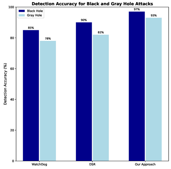 Figure 2 presents a comparison of the detection accuracy (%) for black hole and gray hole attacks. The analysis comprises three methodologies: Watchdog, DSR, and a proposed hybrid approach. The results show that each approach is effective in detecting these two types of attacks. The watchdog demonstrated a moderate level of accuracy, with detection rates of for black hole attacks and for gray hole attacks. DSR achieved results with an accuracy of for black hole attacks and for gray hole attacks. The hybrid approach achieved a detection accuracy of for black hole attacks and for gray hole attacks. The findings suggest that the hybrid approach outperforms Watchdog and DSR in accurately detecting both types of attacks. This solution shows promise in enhancing network security against such threats.