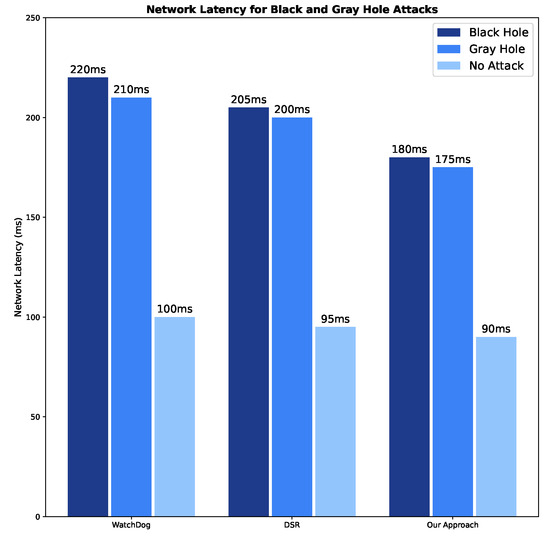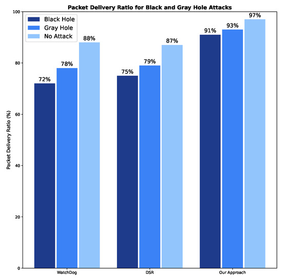Figure 4 shows the packet delivery ratio (PDR) (%) for three scenarios: black hole attack, gray hole attack, and no attack. The PDR was measured using Watchdog, DSR, and the proposed hybrid approach. The PDR, also known as the packet delivery ratio, is a metric used to determine the percentage of packets that successfully reach their intended destination out of the total number of packets sent. In the black hole attack scenario Watchdog achieved a packet delivery ratio (PDR) of . DSR achieved higher performance of , while the hybrid approach exhibited the highest success rate of . In a gray hole attack, Watchdog records a PDR of . DSR enhances it to , and the hybrid approach maintains a PDR of . In the absence of attacks, the no-attack scenario demonstrated higher PDRs when all three methodologies were employed. Watchdog had a PDR of , DSR had a PDR of , and the hybrid approach had a PDR of . The results indicate that the hybrid approach is effective in maintaining a high PDR even during attack scenarios. This suggests that it has the potential to ensure successful packet delivery in the presence of network threats when compared to other methods.