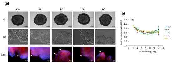 (a) Caco-2/HT-29-MTX spheroid growth in the presence of sea buckthorn leaf extract (RL, 50 µg/mL) or fruit extract (RO, 50 µg/mL) and Cornelian cherry leaf (DL, 50 µg/mL) and fruit (DO, 50 µg/mL) extracts. Con—cells treated with the appropriate amount of solvent. Phalloidin–Texas Red staining for actin indicates the presence of a brush border in the differentiated Caco-2 cells (arrows). Nuclei are counterstained with Hoechst 33342. Differential interference contrast images (DIC) show the spheroid structure. (b) The projection areas of the spheroids from all the experimental groups do not differ significantly during the culture (mean ± SD, n = 5); ns—differences not significant.