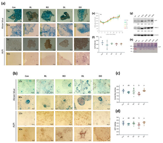 Nevertheless, all the extracts, but particularly sea buckthorn (RO) and Cornelian cherry fruit (DO), enhanced the differentiation markers of goblet cells, as indicated by the darker Alcian blue staining of the mucins (Figure 2a). Similarly, the spheroids that grew in the presence of the extracts demonstrated a stronger activity of intestinal alkaline phosphatase (ALPI), a brush border enzyme regarded as a microvilli marker (Figure 2a). In the two-dimensional cultures, Cornelian cherry leaf extract (DL) significantly promoted differentiation into both enterocyte and goblet cells grown on microscopic slides (Figure 2b–d) and a similar trend was observed for the sea buckthorn leaf extract (RL), although the differences did not reach statistical significance (Figure 2b–d).
