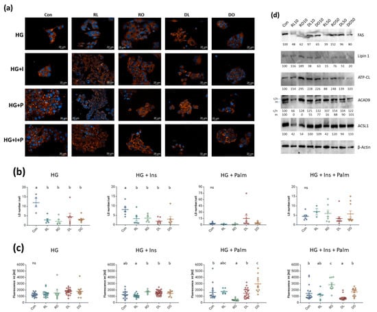 Nile red staining for intracellular lipid storage in HepG2 cells subjected to metabolic stress: 25 mM glucose (HG); 25 mM glucose and 100 nM insulin (HG + I); 25 mM glucose and 100 µM palmitate (HG + P); 25 mM glucose, 100 nM insulin and 100 µM palmitate (HG + I + P). (a) Fluorescent staining of lipids (red), nuclei are counterstained with Hoechst 33342 (blue), (b) Average number of lipid droplets per cell (mean ± SEM). (c) Mean intensity of Nile red fluorescence in arbitrary units (mean ± SD), the same letters represent lack of statistically significant differences at p < 0.05, ns—differences not significant. (d) Immunoblotting detection of enzymes engaged in lipid metabolism in the HepG2 lysates: FAS—fatty acid synthase; ATP-CL—ATP citrate lyase; ACAD9—long chain acyl-CoA dehydrogenase 9; m—mitochondrial, c/n—cytoplasmic/nuclear form; ACSL1—long chain acyl-CoA synthetase 1. Probing for β-actin serves as a loading control. The numbers below the protein bands express the band intensity normalised to β-actin in relation to the control (Con = 100%). RL—sea buckthorn extract (50 µg/mL); RO—sea buckthorn fruit extract (50 µg/mL); DL—Cornelian cherry leaf extract (50 µg/mL); DO—Cornelian cherry fruit extract (50 µg/mL); Con—cells treated with the appropriate amount of solvent. Panels (b,c) created with https://www.biorender.com/.