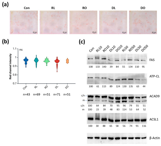 Phagocytosis of oxLDL particles by Raw 264.7 monocytes (oil red O staining, (a)). Quantitative analysis of microscopic images (b). The fiddle plots present the distribution of cell staining intensity using arbitrary values from the ImageJ Fiji software, the lower values are the darker staining colour; differences not significant (ns). (c) Immunoblotting detection of enzymes engaged in lipid metabolism in the Raw 264.7 lysates: FAS—fatty acid synthase; ATP-CL—ATP citrate lyase; ACAD9—long chain acyl-CoA dehydrogenase 9; ACSL1—long chain acyl-CoA synthetase 1. Probing for β-actin serves as a loading control. The numbers below the protein bands express the band intensity normalised to β-actin in relation to the control (Con = 100%). RL—sea buckthorn extract (50 µg/mL); RO—sea buckthorn fruit extract (50 µg/mL); DL—Cornelian cherry leaf extract (50 µg/mL); DO—Cornelian cherry fruit extract (50 µg/mL); Con—cells treated with the appropriate amount of solvent. Panel (b) created with https://www.biorender.com/.