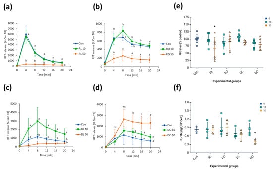 Reactive oxygen production (oxidative burst) in PMA-stimulated Raw 264.7 cells (a–d). The plots show luminescent signals using arbitrary units expressed as a percentage of the value of the control at the start of the reaction (time 0), the same letters represent lack of statistically significant differences at p < 0.05; ns—insignificant differences. (e) Concentration of NO metabolites (nitrites nmol/(ml × cell)) in the culture supernatant from P388D1 monocytes stimulated with LPS. (f) Concentration of IL-1β in the culture supernatant from P388D1 monocytes stimulated with LPS. * p < 0.05 vs. Con. RL—sea buckthorn extract (10, 50 µg/mL); RO—sea buckthorn fruit extract (10, 50 µg/mL); DL—Cornelian cherry leaf extract (10, 50 µg/mL); DO—Cornelian cherry fruit extract (10, 50 µg/mL); Con—cells treated with the appropriate amount of solvent. Panels (e,f) created with https://www.biorender.com/.
