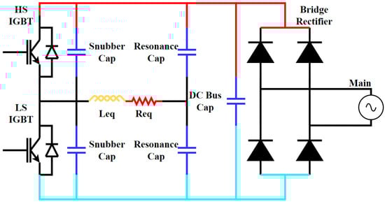 In Figure 1, a full-bridge rectifier is used to obtain DC voltage from the AC network. An IGBT (insulated gate bipolar transistor) is used as a semiconductor power switch. The switches are positioned in a half-bridge configuration. ‘HS IGBT’ represents the upper switch, while ‘LS IGBT’ represents the lower switch. ‘Snubber Cap’ represents the film capacitor used in the passive snubber cell. In contrast, ‘Resonance Cap’ represents the resonance capacitors used to create high-frequency sinusoidal oscillation, and film capacitors are generally preferred. A ‘DC Bus Cap’ capacitor is used to suppress high-frequency noises that will occur in the rectified AC voltage, and low-value (3–5 μF) film capacitors are preferred.