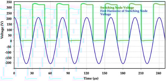 Vpri voltage is the first harmonic component of the switching node voltage, as shown in Figure 3. It is produced by rectifying the main voltage after it is modulated by the half-bridge converter. This modulated voltage is directly applied to the resonant tank, which consists of Ceq and Lcoil.
