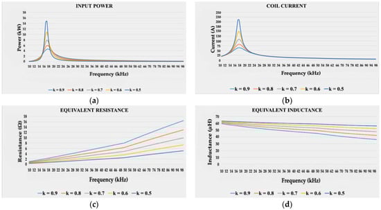 All electrical parameters: (a) input power; (b) input current; (c) equivalent resistance; (d) equivalent inductance. All calculations are implemented under Ceq = 1360 nF, Leq = 65 μH, and VDC = 325 V conditions.