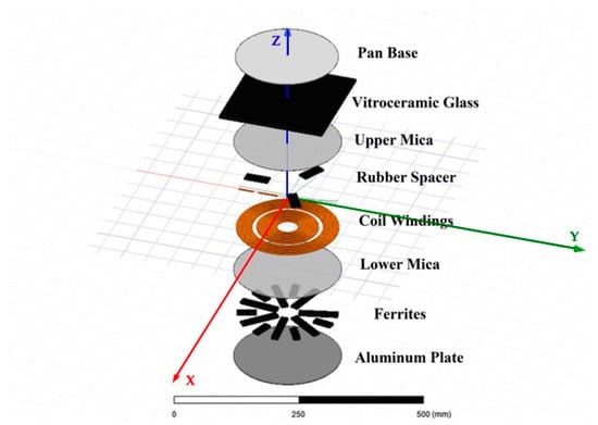 Induction coils are critical to ensuring optimum and efficient power transfer in domestic induction heating applications. The coil-pan equivalent circuit will determine the power transferred to the load and the switching frequency. The basic components of the induction coils are windings, ferrites, and an aluminum plate. The structure of an induction coil is shown in Figure 6. Windings and ferrites are used to create the required magnetic field. The aluminum plate acts as a cooler for the ferrites and prevents the electronic circuit from being affected by the magnetic field. The chemical and physical properties of the aluminum plates used in commercialized induction cookers are similar for all products.