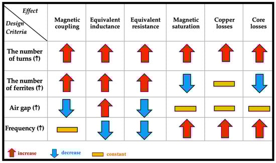 The number of windings and magnetic cores are the main parameters that determine the equivalent inductance and resistance. The value of the equivalent inductance determines the switching frequency with the resonance capacitor, while the equivalent resistance determines the power ratings. The inductance value increases with the number of turns. However, the higher number of turns means higher copper loss due to the skin effect that occurs in the windings, lower efficiency, and lower performance. In addition, additional losses lead to increased operating temperatures that could lead to magnetic core saturation. The number of magnetic cores increases the equivalent inductance and resistance values. Meanwhile, magnetic cores are so critical that they directly affect magnetic saturation and magnetic cores suitable for high frequencies should be preferred. As a result of the FEM analysis, an appropriate saturation value should be selected according to the maximum magnetic field to which the magnetic core will be exposed. When an induction coil saturates, it causes catastrophic results, such as short-circuits in semiconductor switches. The higher the number of magnetic cores, the lower the risk of magnetic saturation. Figure 7 summarizes basic induction coil design parameters and their effects.